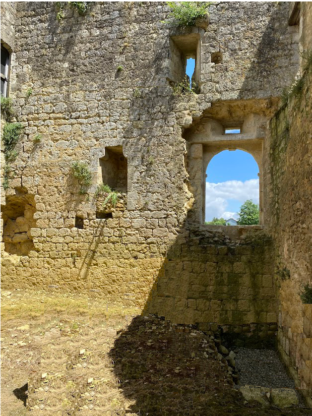 -une zone « seigneuriale », de résidence, encore présente à droite (au Sud), presque entièrement détruite à gauche, avec des fenêtres géminées, analogues à celles que l’on peut voir à Mansencôme, château voisin, un peu plus tardif.