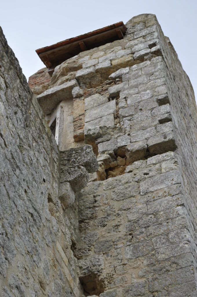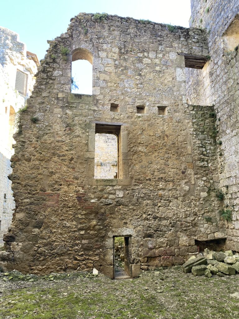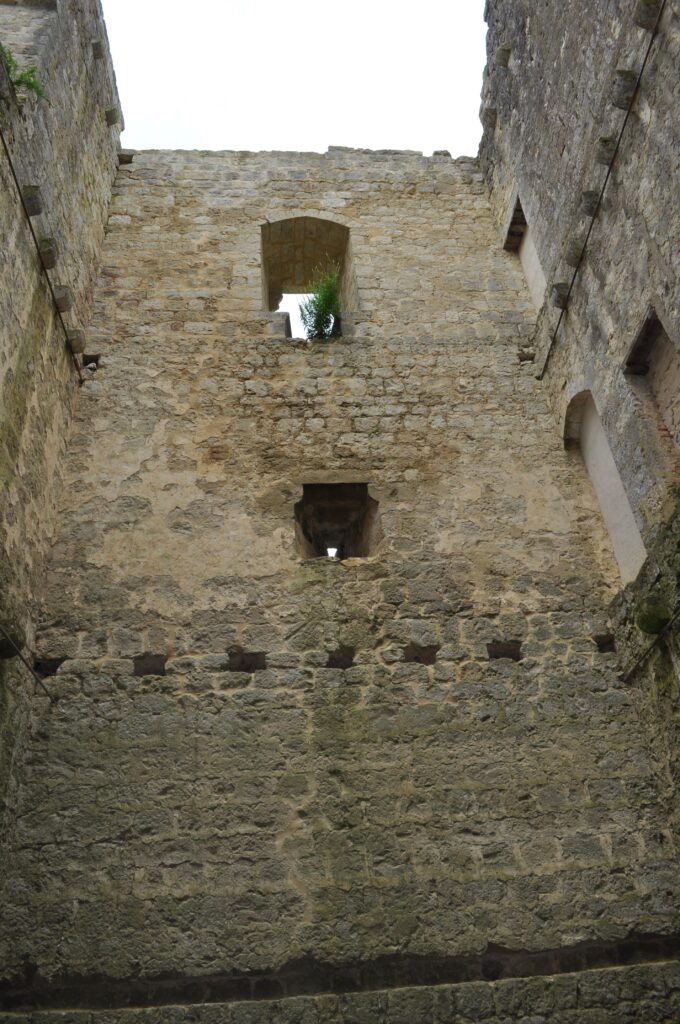 Cette grande boîte vide, sans couvercle, nous montre des murs massifs, d’un mètre à un mètre cinquante d’épaisseur (les murs de la tour sont plus épais). Il y a peu d’ouvertures, certaines plus ou moins soigneusement bouchées. On ne trouve pas trace d’escalier. Ces murs externes datent de sept cents ans, faits en pierre de « gros appareil » enserrant un remplissage de moellons dans un mortier traditionnel.
