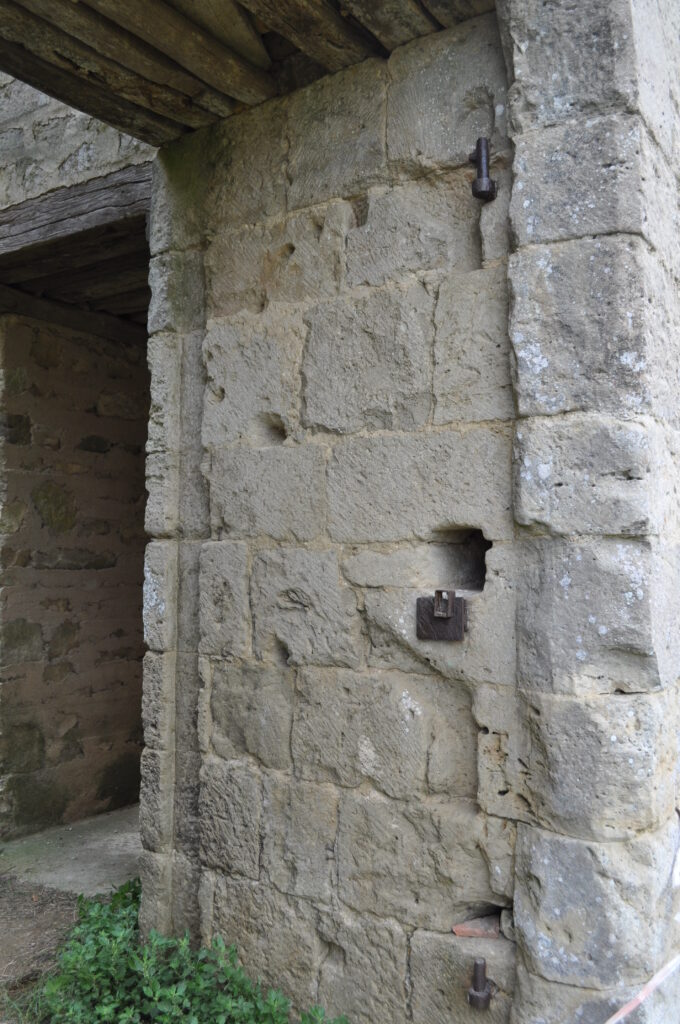 Les encoches grossières sur le mur nord, dessinant deux lignes alternées, correspondent sans doute à l’installation du fenil (appelé « fénière » au XVI° siècle), en fait, des mangeoires à chevaux. Le plancher se trouvait un demi-mètre plus bas.