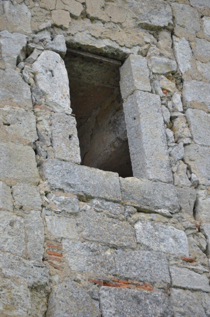 Tout en haut, à droite de la tourelle d’angle, le mur résiduel montre l’ébauche d’un cadre de fenêtre (troisième étage).