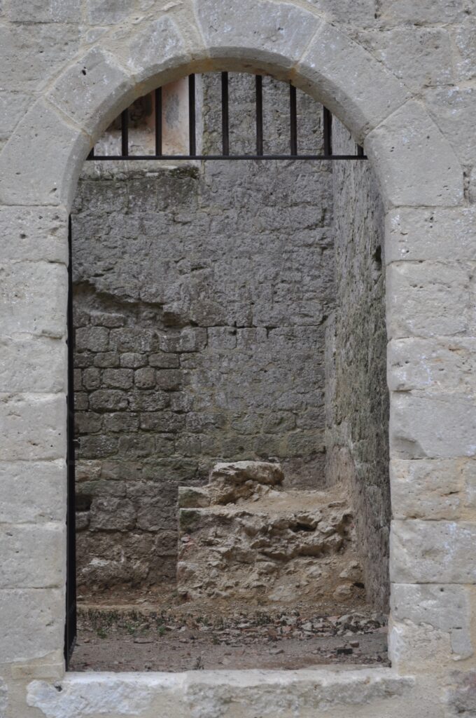 La porte, récemment dégagée, est accolée au mur de refend. On reconnaît son linteau en pierre, avec, au-dessus, un orifice (comblé par une pierre) qui pouvait servir de « judas ». Comment était mobilisé le manteau du pont-levant ? On en voit à l’extérieur l’axe de rotation, mais rien ne subsiste des mécanismes de levée-abaissement.