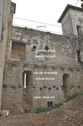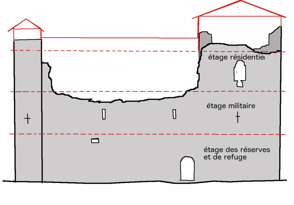 Il est logique de penser que l’étage était muni de fenêtres du type de celles qui restent dans la tour, et communiquer avec la « la galerie », au-dessus du mur de refend.